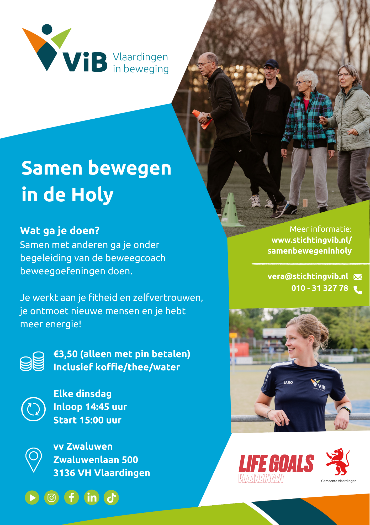 Maak kennis met bewegen in Holy. Voor iedere Vlaardinger die weer in beweging wilt komen is er elke dinsdag van 14:45 - 16:00 uur een open inloop voor volwassenen. Elke week wordt er gestart bij VV Zwaluwen aan de Zwaluwenlaan 500, 3136 VH Vlaardingen. Achteraf drinken de deelnemers gezellig met elkaar een kopje koffie of thee. Met elkaar maken we er een gezellige activiteit van! De kosten hiervoor zijn 3,50 euro. Je kunt alleen met pin betalen.