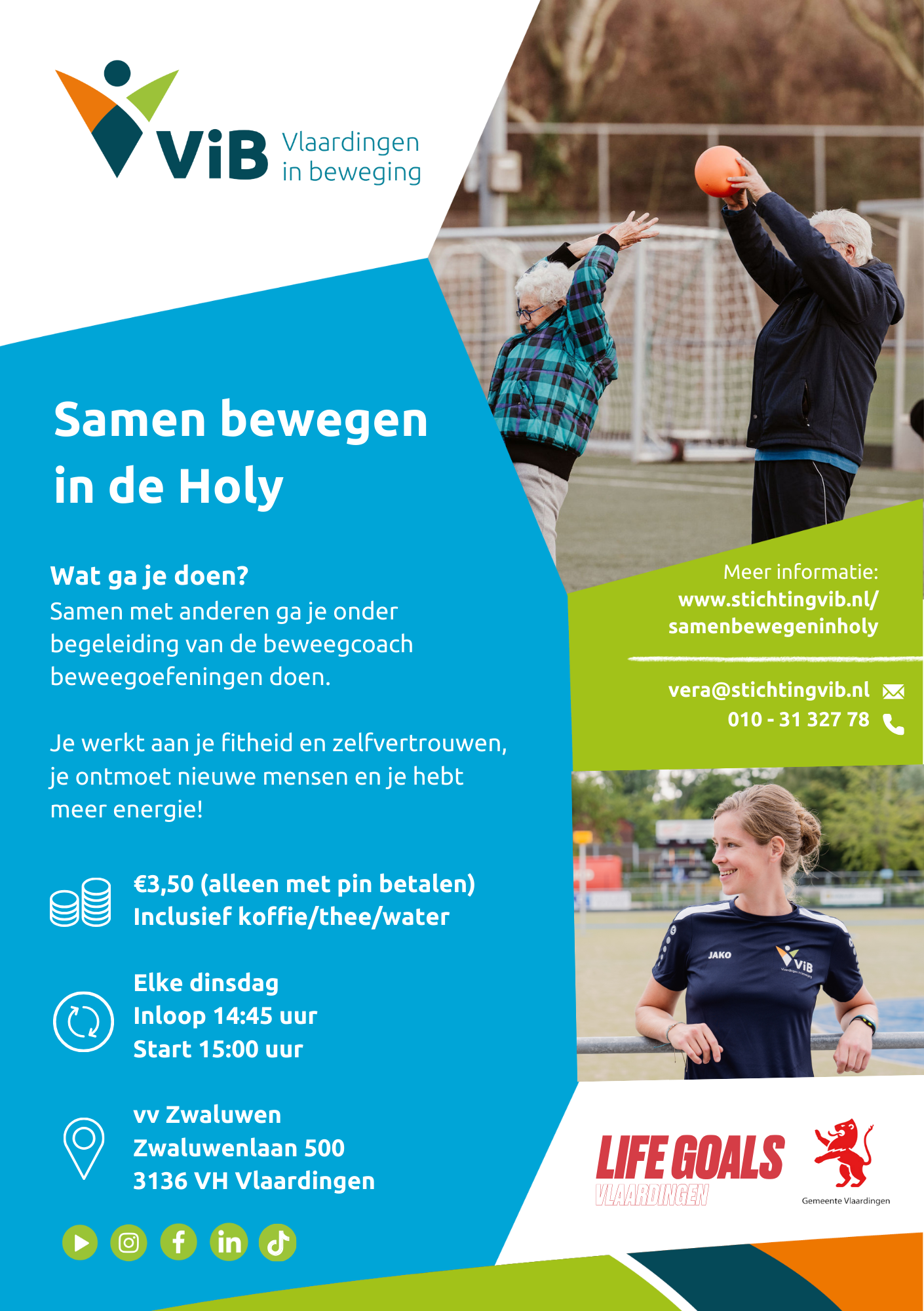 Maak kennis met bewegen in Holy. Voor iedere Vlaardinger die weer in beweging wilt komen is er elke dinsdag van 14:45 - 16:00 uur een open inloop voor volwassenen. Elke week wordt er gestart bij VV Zwaluwen aan de Zwaluwenlaan 500, 3136 VH Vlaardingen. Achteraf drinken de deelnemers gezellig met elkaar een kopje koffie of thee. Met elkaar maken we er een gezellige activiteit van! De kosten hiervoor zijn 3,50 euro. Je kunt alleen met pin betalen.